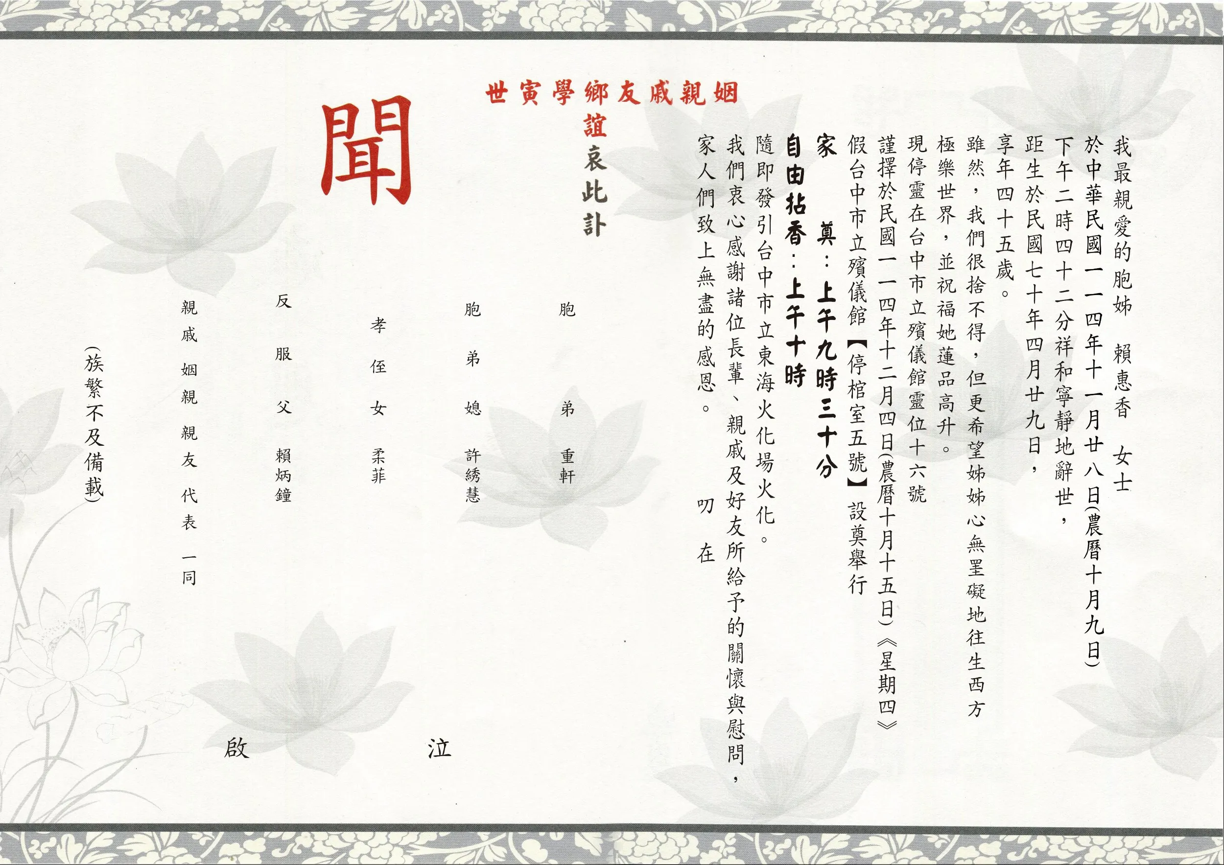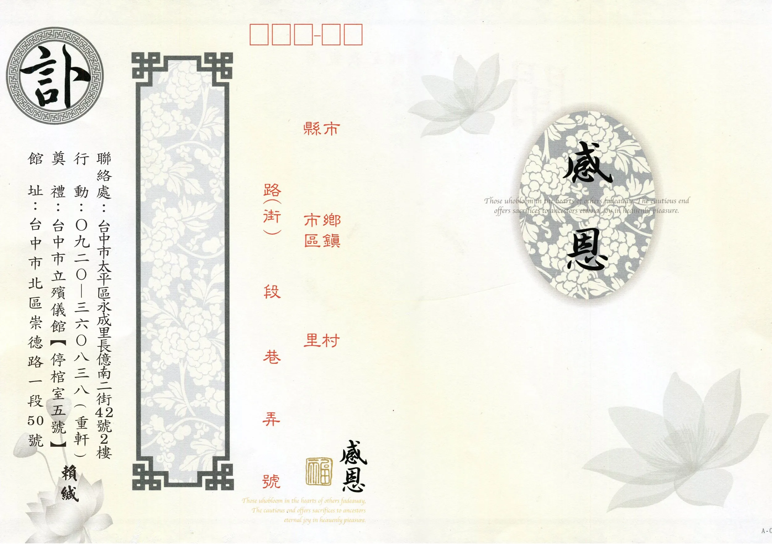 追思會場:台中市北區崇德路一段50號 停棺室五號